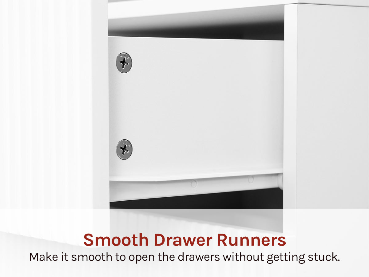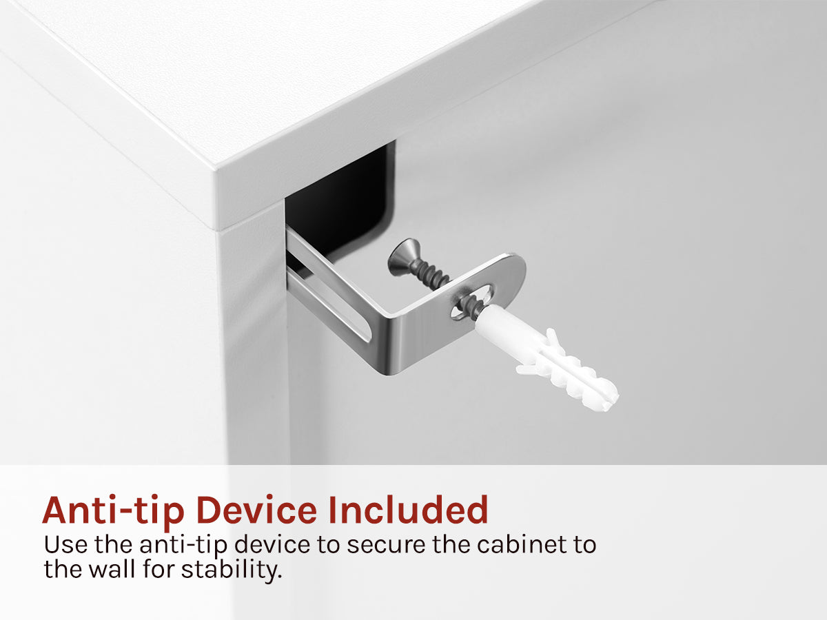 Robusta, stabile, durevole: la cassettiera in legno di classe E1 con impiallacciatura in melammina è dimensionale, durevole e la sua superficie è liscia, resistente ai graffi e facile da pulire. La protezione anti-inclinazione e i poggiapiedi aggiuntivi in basso garantiscono maggiore stabilità durante l'uso.