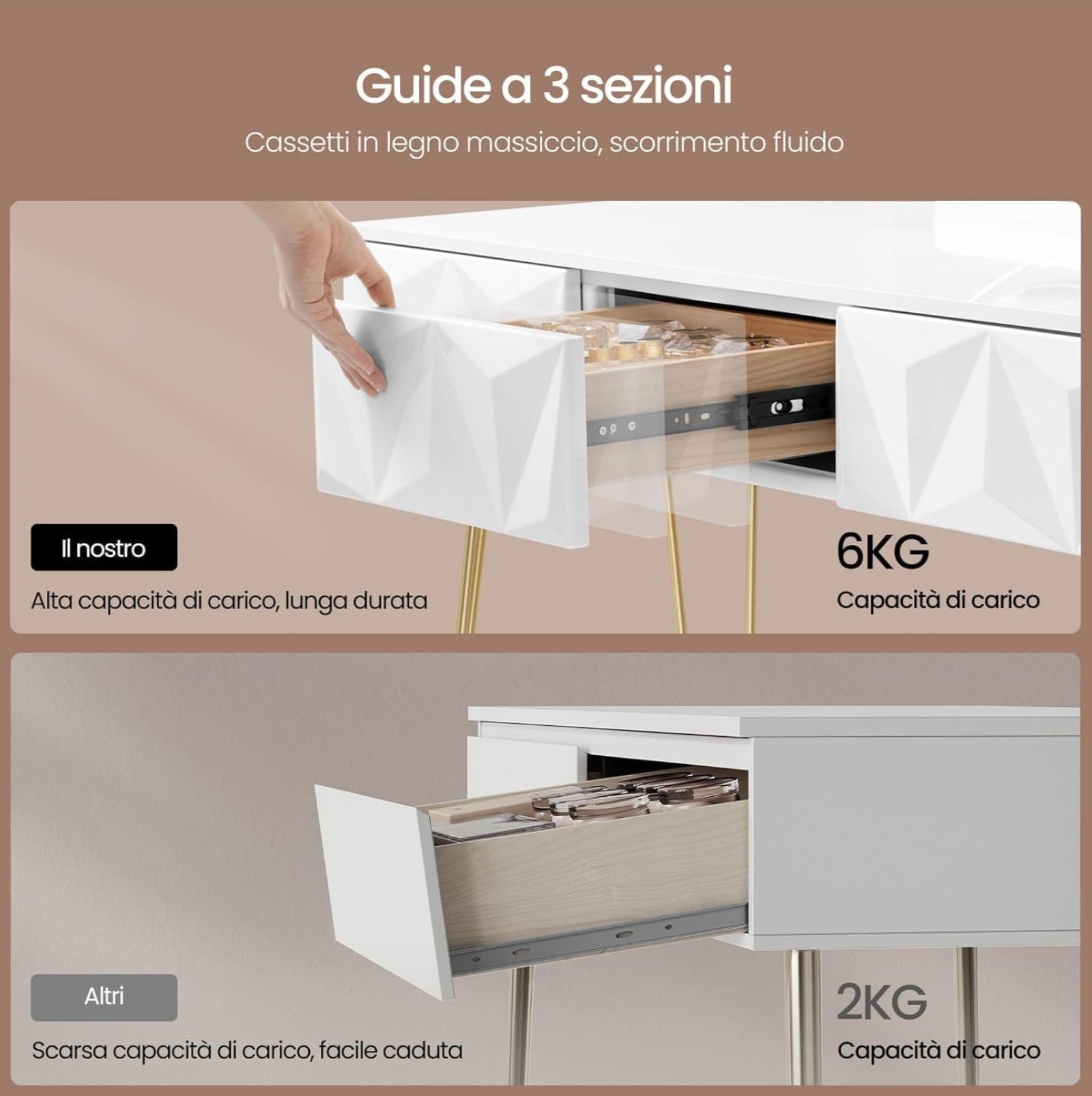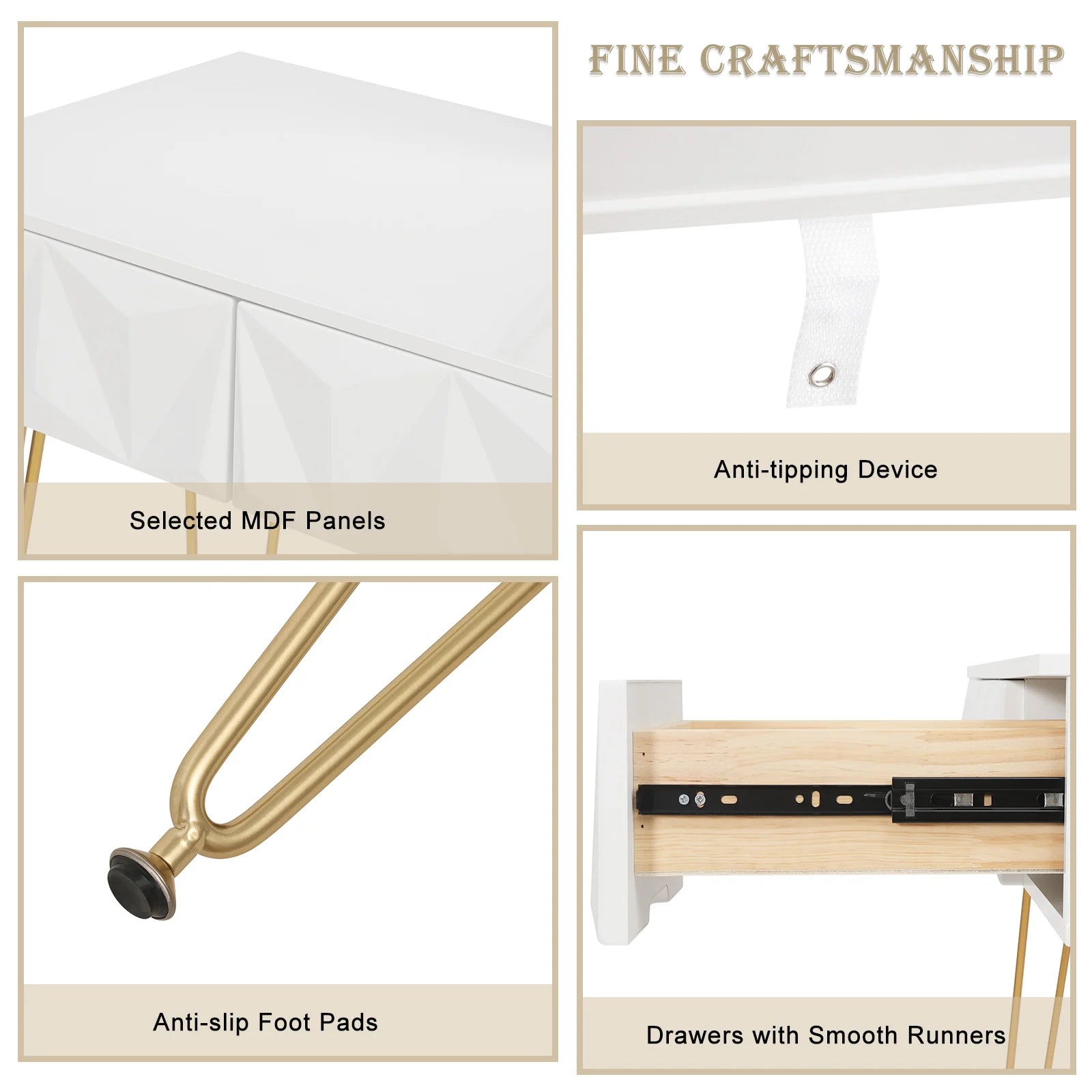 Solido e stabile: il tavolo cosmetico realizzato in MDF E1 è rivestito in PVC su 3 lati, sembra bello e facile da pulire. Per una migliore stabilità e per proteggere il pavimento, le gambe in metallo sono rivolte verso l'alto e dotate di ali antiscivolo.