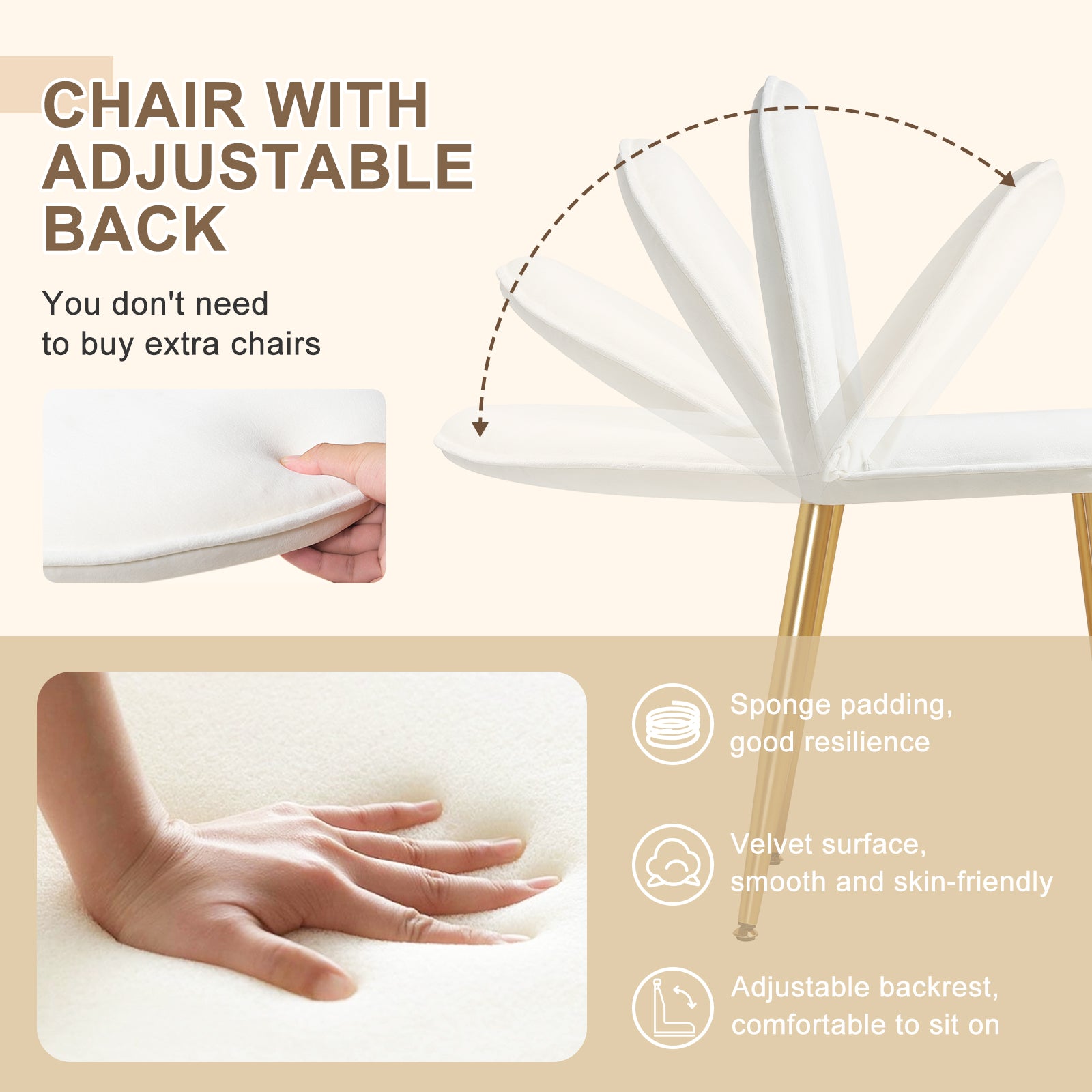 Sedia per il trucco ergonomica: la toeletta include anche una sedia abbinata a una morbida fodera in morbido velluto e imbottitura in schiuma ad alta densità. Il suo schienale è regolabile, quindi puoi sederti comodamente durante la cura della pelle o il trucco